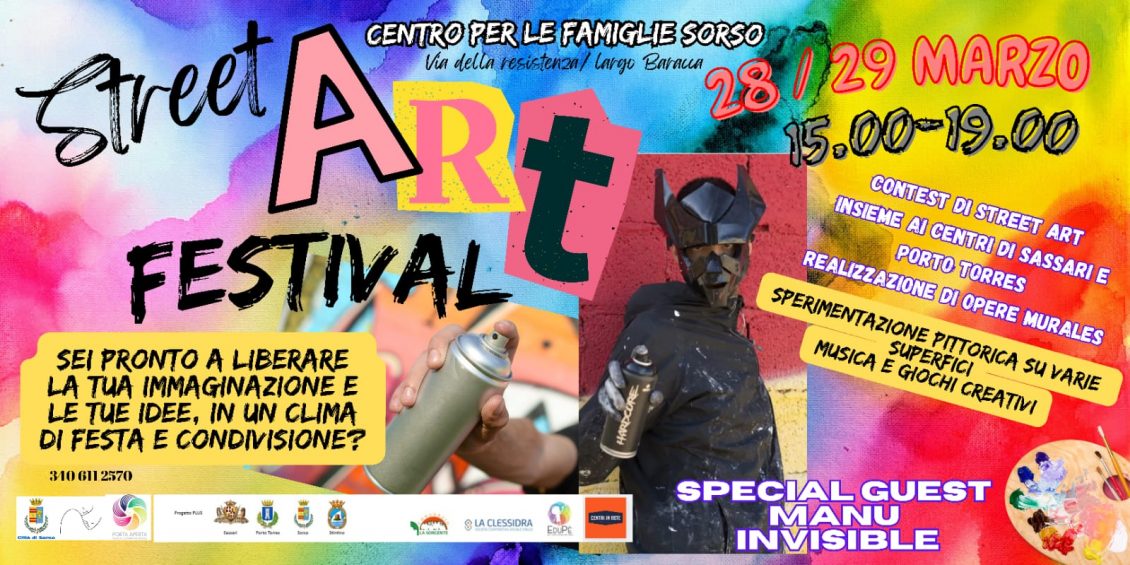Per l’occasione, a Sorso sarà organizzato un vero e proprio Street Art Festival, con sperimentazioni pittoriche, musica, giochi, percorsi creativi, animazione, merenda e tanta festa in un clima gioioso di condivisione adatto a tutte le età!