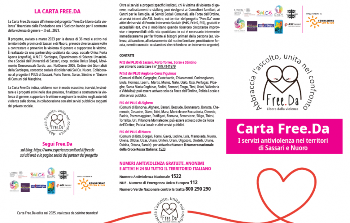 Realizzata all’interno del progetto ” “Free.Da – Liberə dalla violenza”, finanziato da Fondazione CON IL SUD , la Carta Free.Da indica i servizi principali a contrasto della violenza di genere, attivi nei due territori del progetto: le (ex) province di Sassari e di Nuoro.