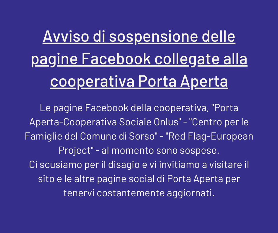 Si avvisa che le pagine Facebook della cooperativa, “Porta Aperta-Cooperativa Sociale Onlus” – “Centro per le Famiglie del Comune di Sorso” – “Red Flag-European Project” – al momento sono sospese.