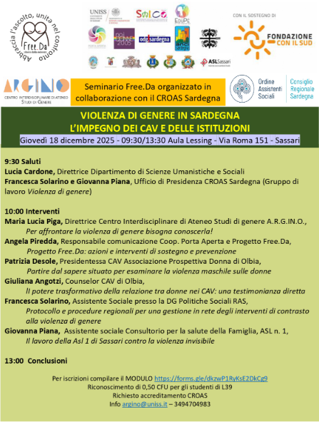 Il Centro interdisciplinare di genere A.R.G.IN.O., afferente al Dipartimento di Scienze Umanistiche e Sociali (DUMAS) dell’Università di Sassari, organizza il seminario «Violenza di genere in Sardegna: l’impegno dei CAV e delle istituzioni», in collaborazione con il CROAS (Consiglio Regionale Ordine Assistenti Sociali) della Sardegna.