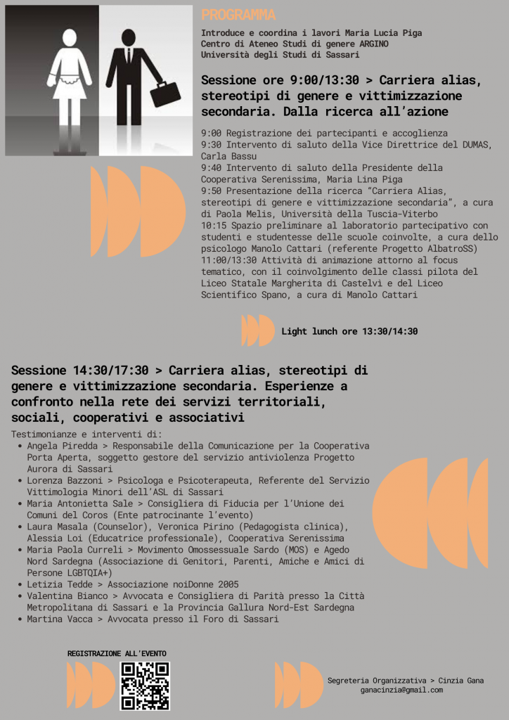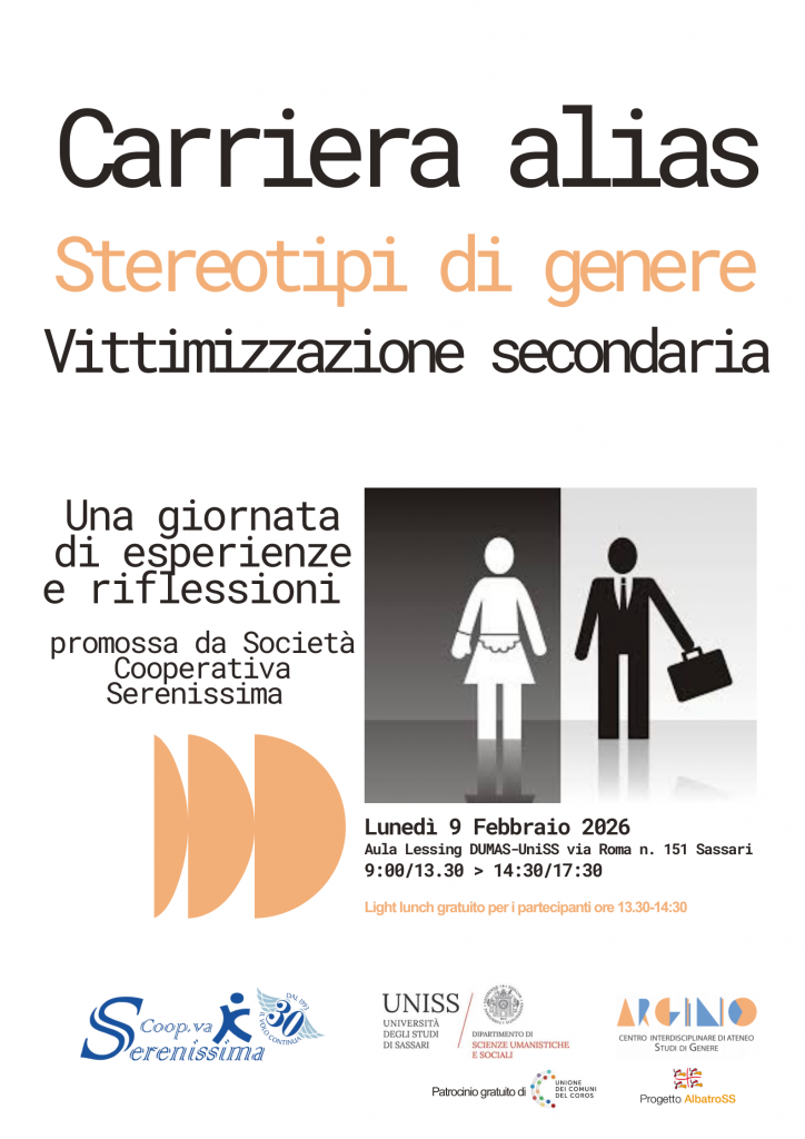 Lunedì 9 febbraio si terrà la giornata formativa “CARRIERA ALIAS – Stereotipi di genere e Vittimizzazione secondaria”, promossa dalla cooperativa sociale Serenissima, in collaborazione con il Dipartimento di Scienze Umanistiche e Sociali (DUMAS) dell’Università di Sassari e il Centro Interdisciplinare Studi di Genere A.R.G.IN.O. che fa capo al Dipartimento. L’evento si terrà per l’intera giornata, con una prima parte più laboratoriale dalle ore 9:00 alle 13.30 e un’altra pomeridiana (14:30-17:30) dedicata alle testimonianze di professioniste a vario titolo coinvolte nella tematica. Fra queste, interverranno in veste di relatrici: – la referente alla comunicazione della nostra cooperativa e del progetto “Free.Da-Liberə dalla violenza” , dott.ssa Angela Piredda, con un intervento sulle metodologie e gli strumenti usati nelle attività di sensibilizzazione, informazione e comunicazione di Progetto Aurora, il servizio antiviolenza che la cooperativa gestisce per il PLUS di Sassari, Porto Torres, Sorso e Stintino. – l’attivista Letizia Tedde per NOI DONNE 2005, con un un intervento su STEP, il progetto di ricerca e formazione dell’Università della Tuscia incentrato sulla violenza contro le donne – Maria Paola Curreli, ex dirigente scolastica, attivista del Movimento Omosessuale Sardo e dirigente nazionale di Agedo (Associazione genitori, parenti, amiche e amici di persone LGBTI+), che parlerà di identità di genere e carriere alias.