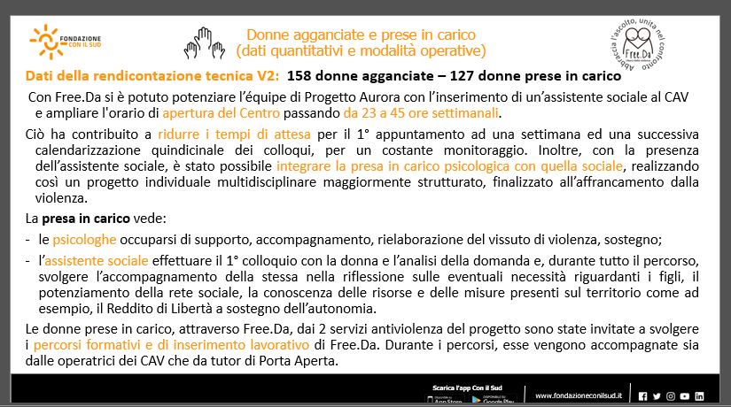 – supporto alle vittime e ai loro figli/e minori con il potenziamento di Progetto Aurora, attività di formazione e tirocinio per le persone in carico a Progetto Aurora, al Cav di Macomer e al Movimento Omosessuale Sardo ed attività laboratoriali per i/le minori ospiti della Casa di Accoglienza di Progetto Aurora;