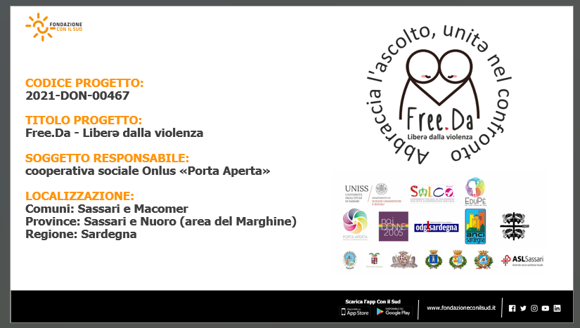 Vi aspettiamo il 14 novembre, ore 17-19, presso lo spazio “Parliamone, SORÈ” di SORÈ Concept Store (Sassari, Via Spano 7) per parlare del servizio antiviolenza Progetto Aurora e di Free.Da-Liberə dalla violenza, il progetto finanziato da Fondazione CON IL SUD che affronta la violenza di genere sotto ogni prospettiva: