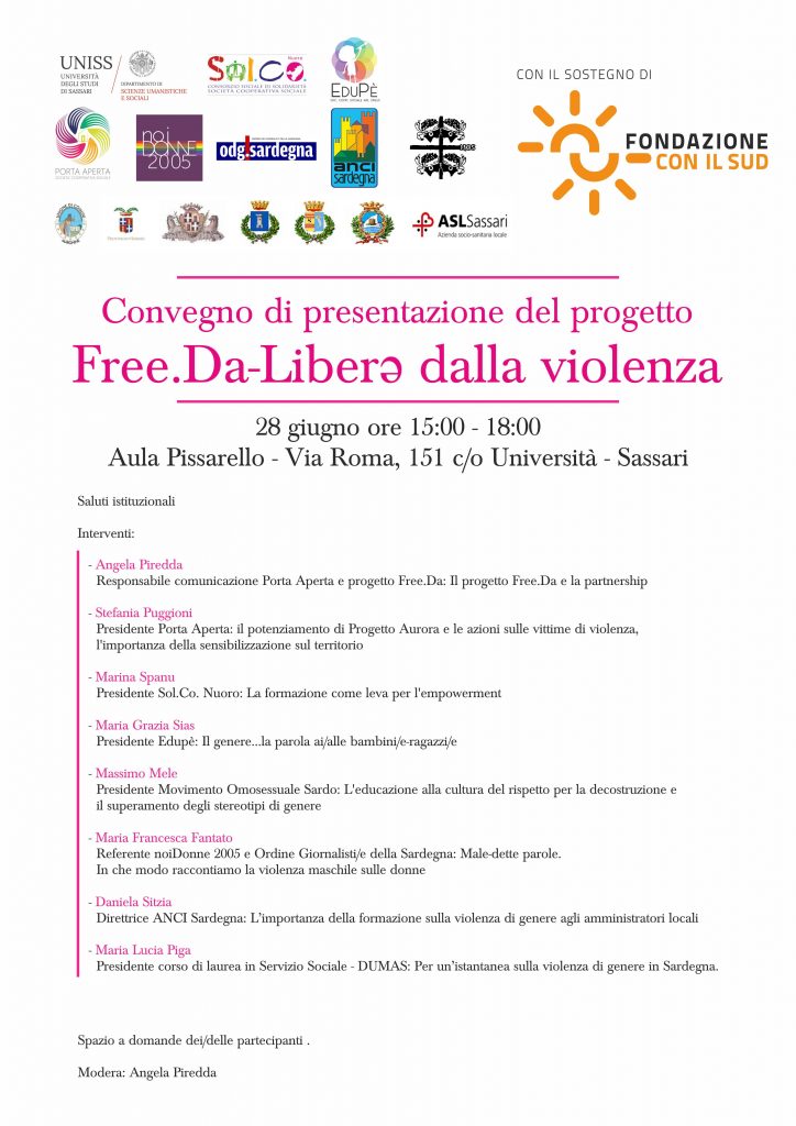 Mercoledì 28 giugno, presso l’Aula Pissarello del Dipartimento di Scienze Umanistiche e Sociali, in Via Roma 151 a Sassari, si terrà il Convegno di presentazione del progetto “Free.Da-Liberə dalla violenza”, finanziato dalla Fondazione con il Sud. L’evento avrà luogo dalle ore 15:00 alle 18:00.